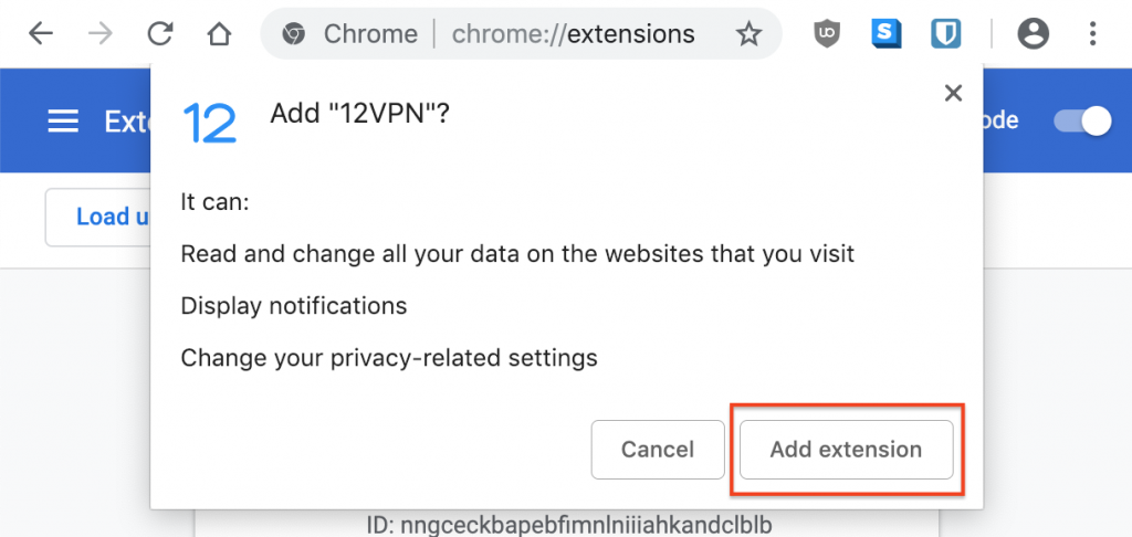 When visiting the Chrome webstore, choose to install our 12VPX Chrome extension. A pop-up will ask you to confirm the installation of the 12VPX Chrome extension: