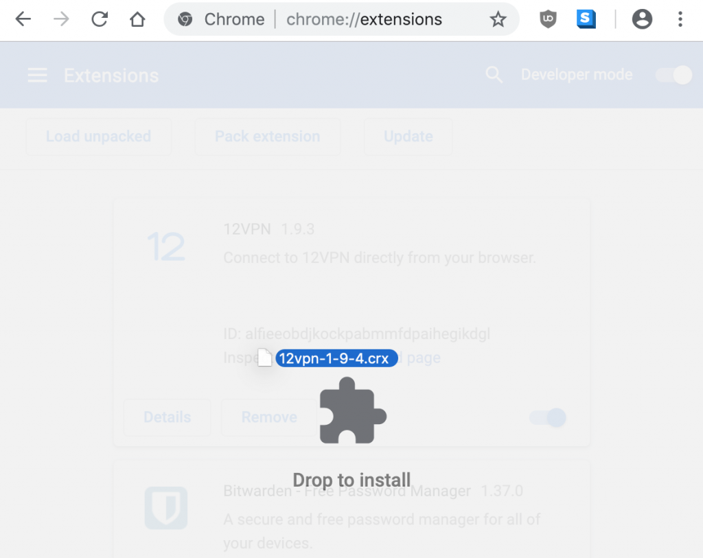 • Drag and drop the 12vpn.crx file from your disk onto the chrome://extensions page. When you drag the file over the extensions screen a Drop to install message will show, like in our screenshot below.