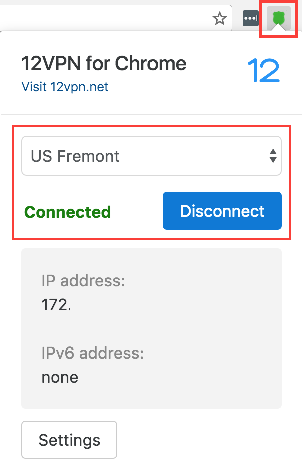 Click the 12VPX action button and select a server. Connect or disconnect from the VPN as you see fit.